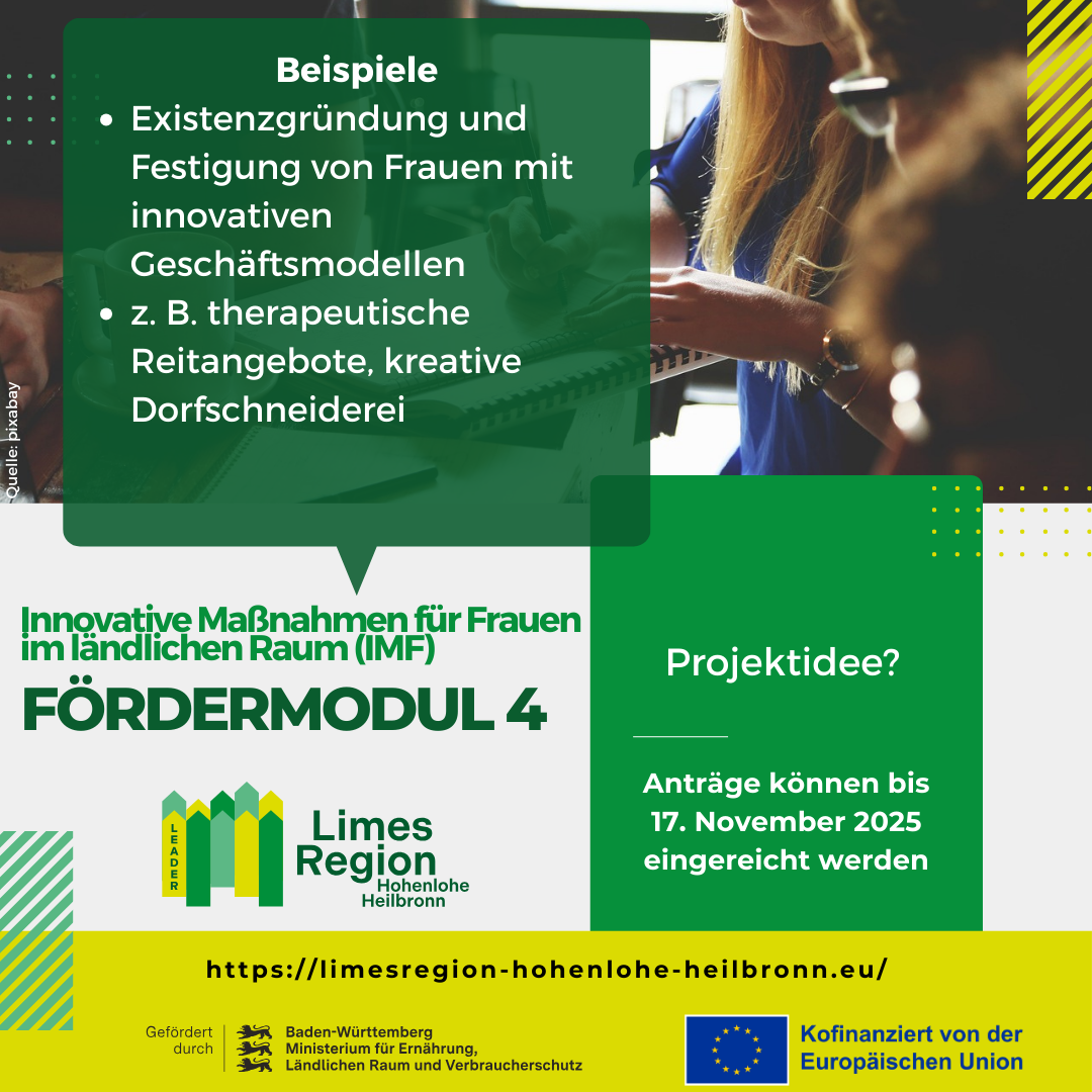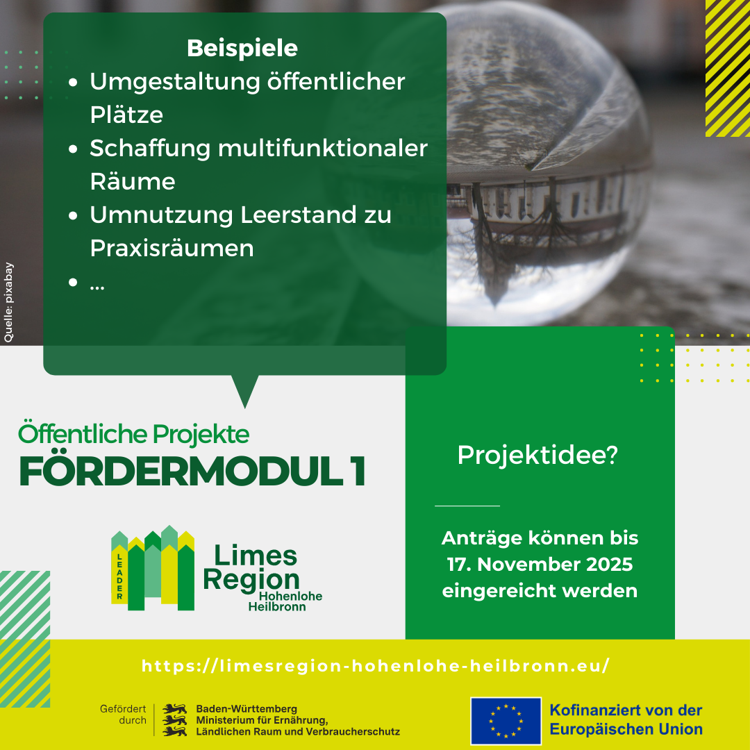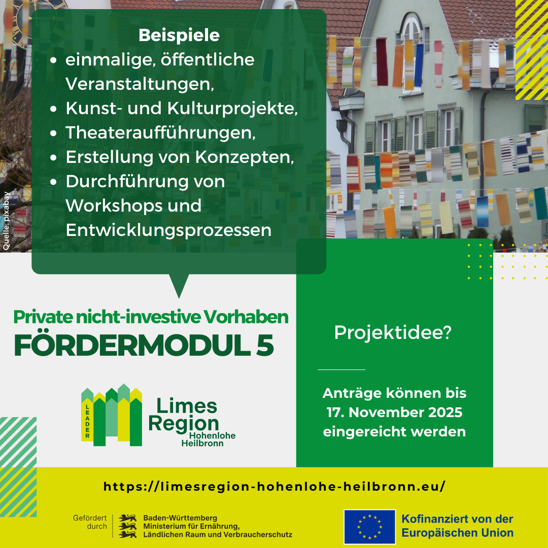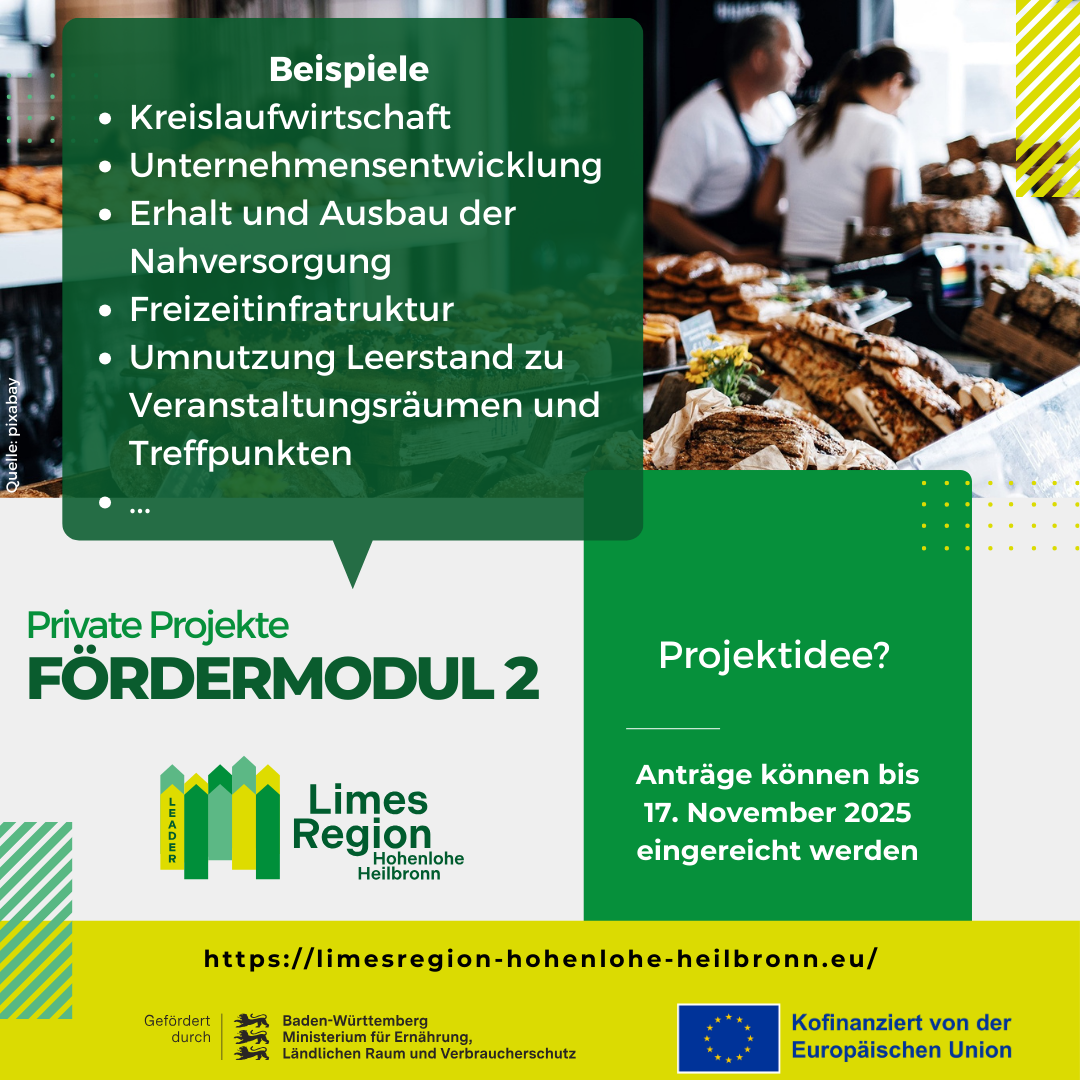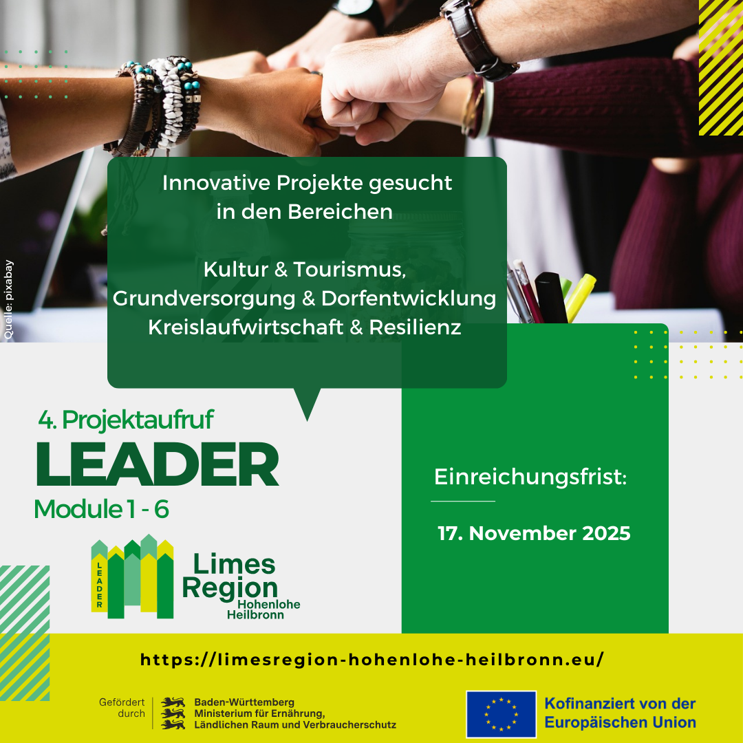 Wieder können Projektanträge im EU- Förderprogramm Leader für das Aktionsgebiet der Limesregion Hohenlohe-Heilbronn gestellt werden. Die Einreichungsfrist für Gesamtkosten von bis zu 700 000 Euro netto geht bis 17. November 2025.